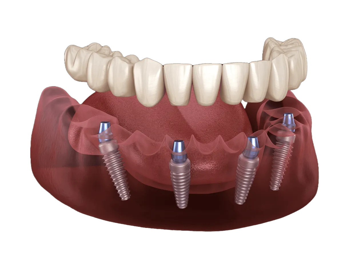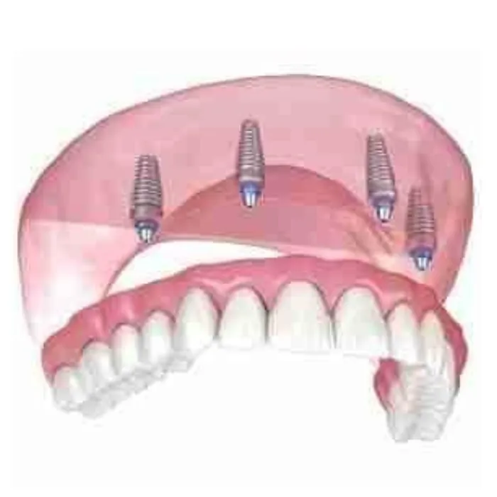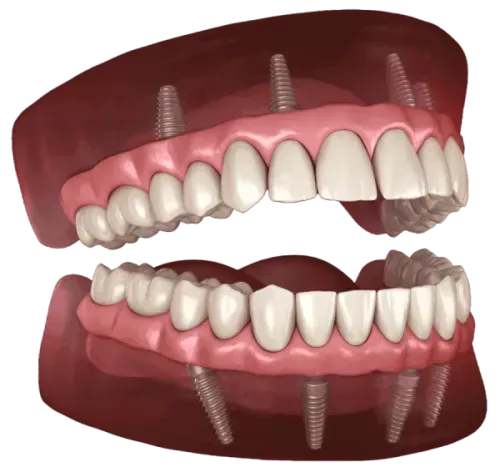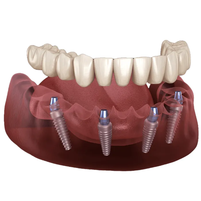 Dental implants are a special way to replace missing teeth. Instead of getting one implant for each missing tooth, a few implants (usually 4 or more) are placed in your jaw to support a full set of new teeth. It's like building a strong bridge with solid support beams, making sure your new teeth are stable and won't move around.